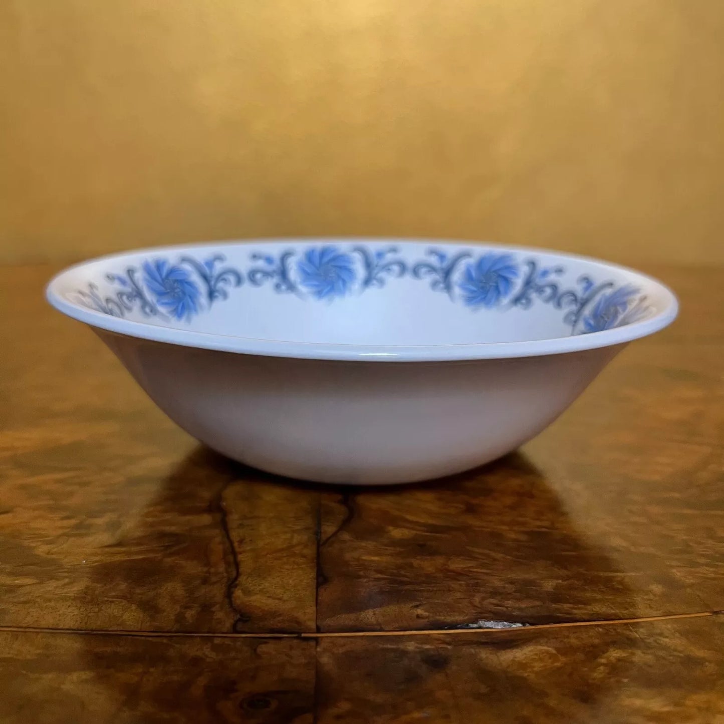 Description: Blue border print around bowl, slight wear to item.