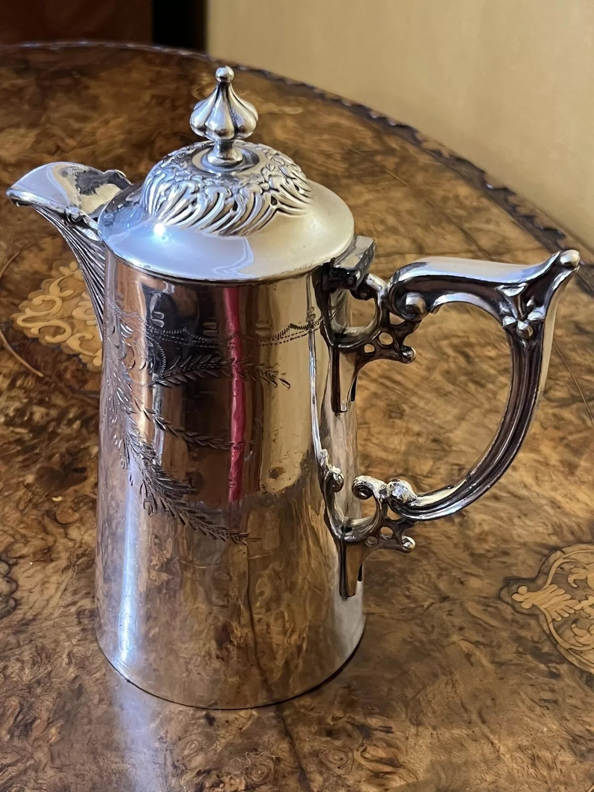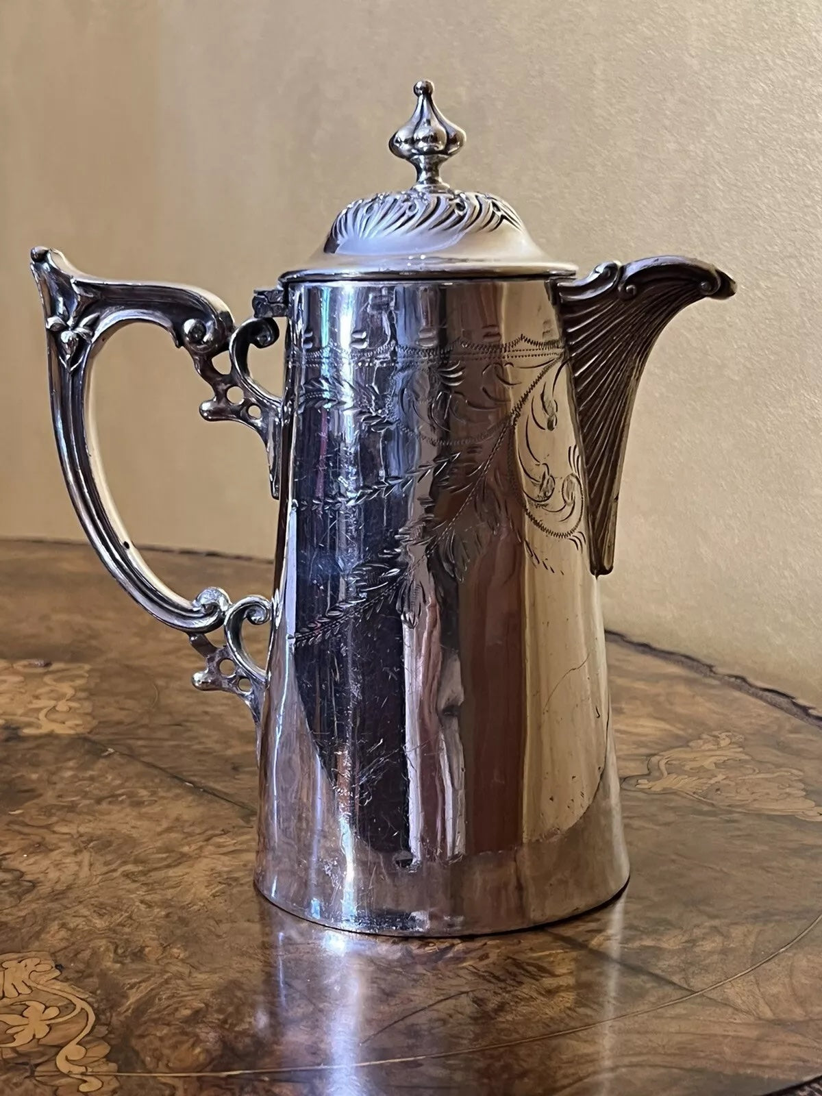 Description: Leaf motif design on the pot with curved lines engraved into the spout, some wear and marks to silver plate and pot, stamped made in England