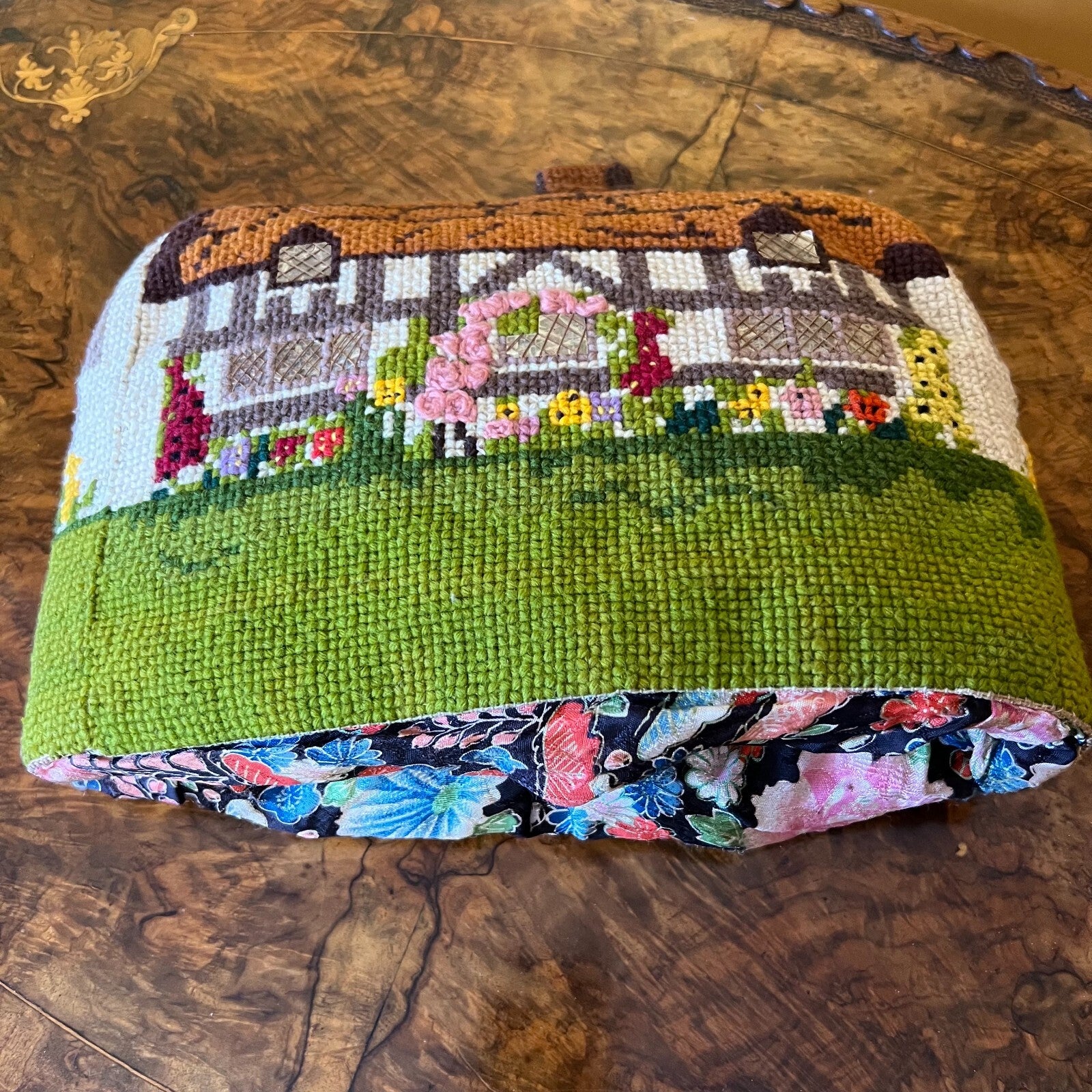 Description: Cross stitch of a house design pot or container warmer. some wear to item.