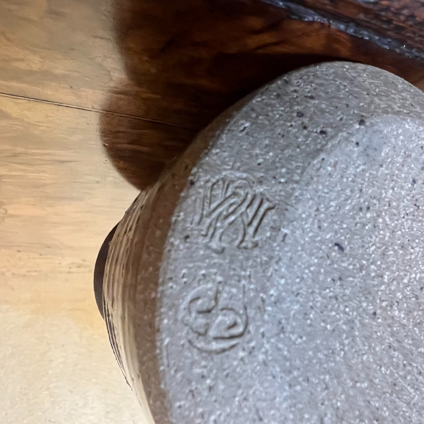 Description: Brown, black and grey vase, stamped on base.