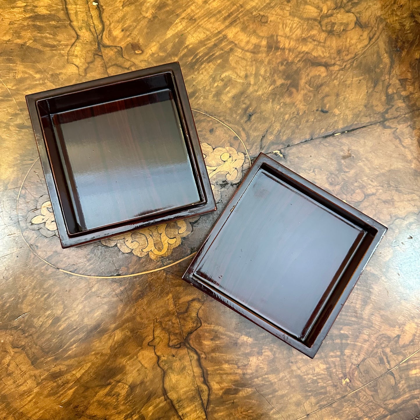 Description: Wood with mother of pearl floral and Butterfly pattern, the base of the box has scratches, some wear to box