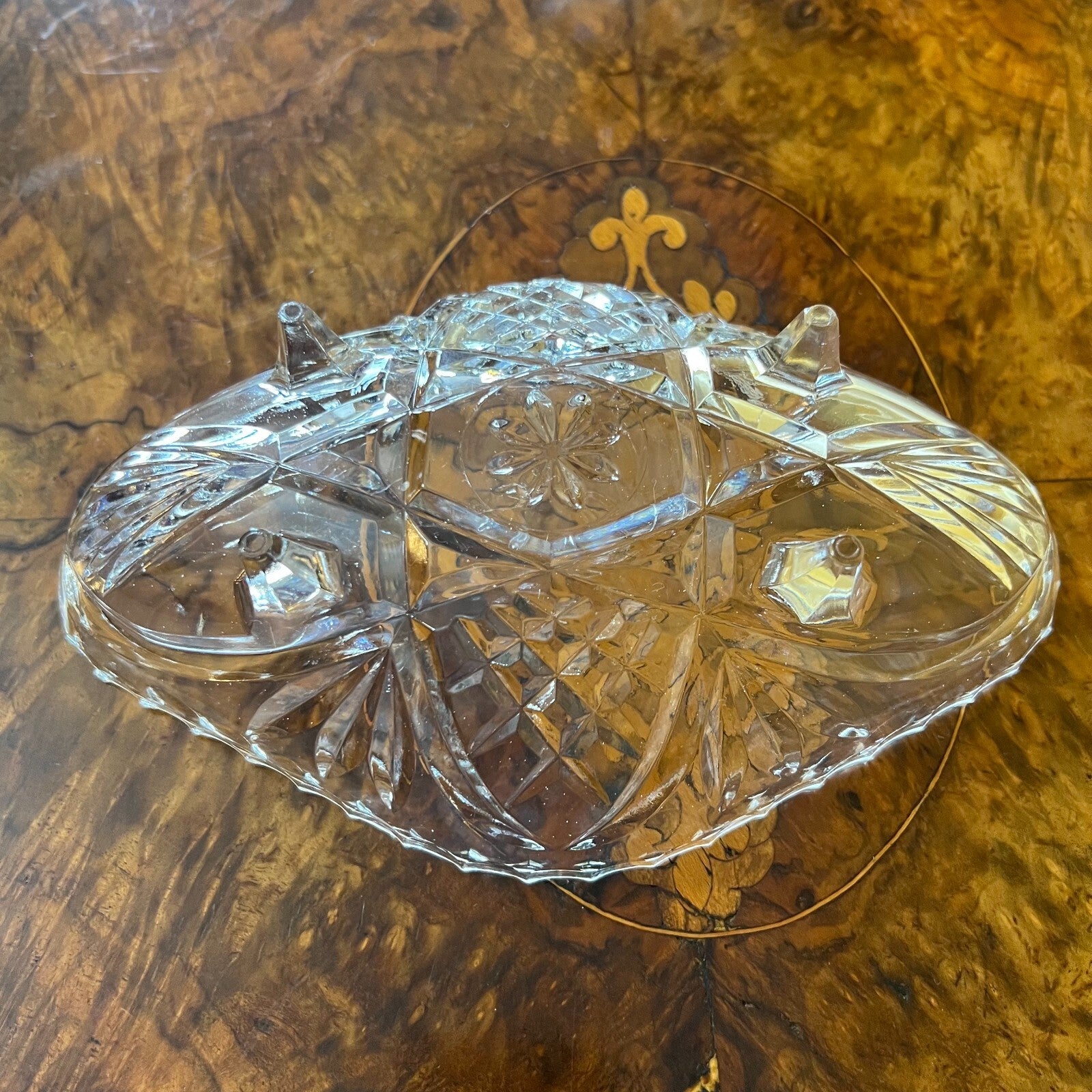 Description: Glass cut design bowl with feet, some scratches to bowl.