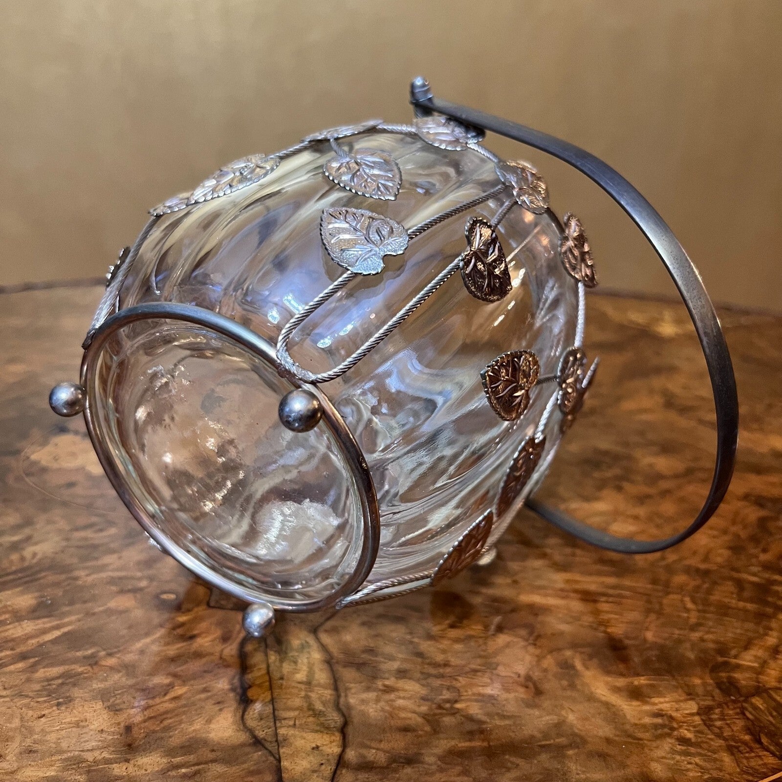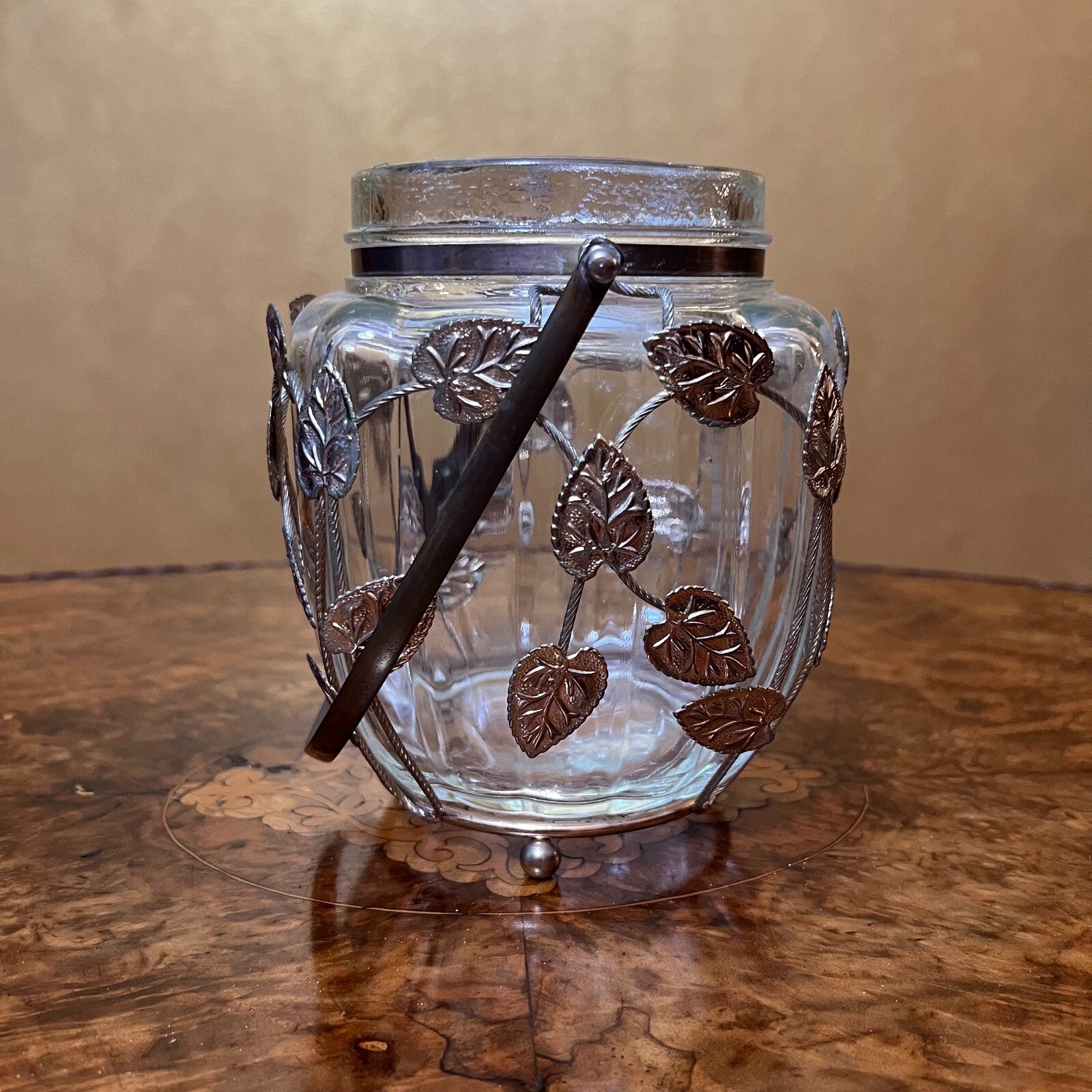 Description: Glass with metal leaves design over glass canister, some wear to metal