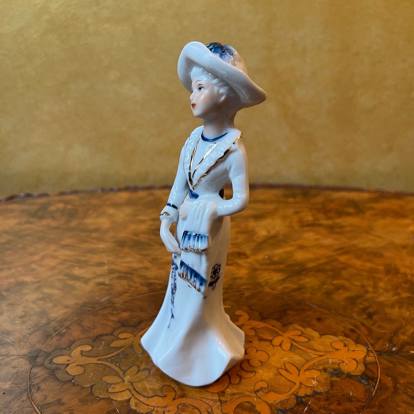 Description: Blue and white porcelain lady dress in elegant dress and hat
