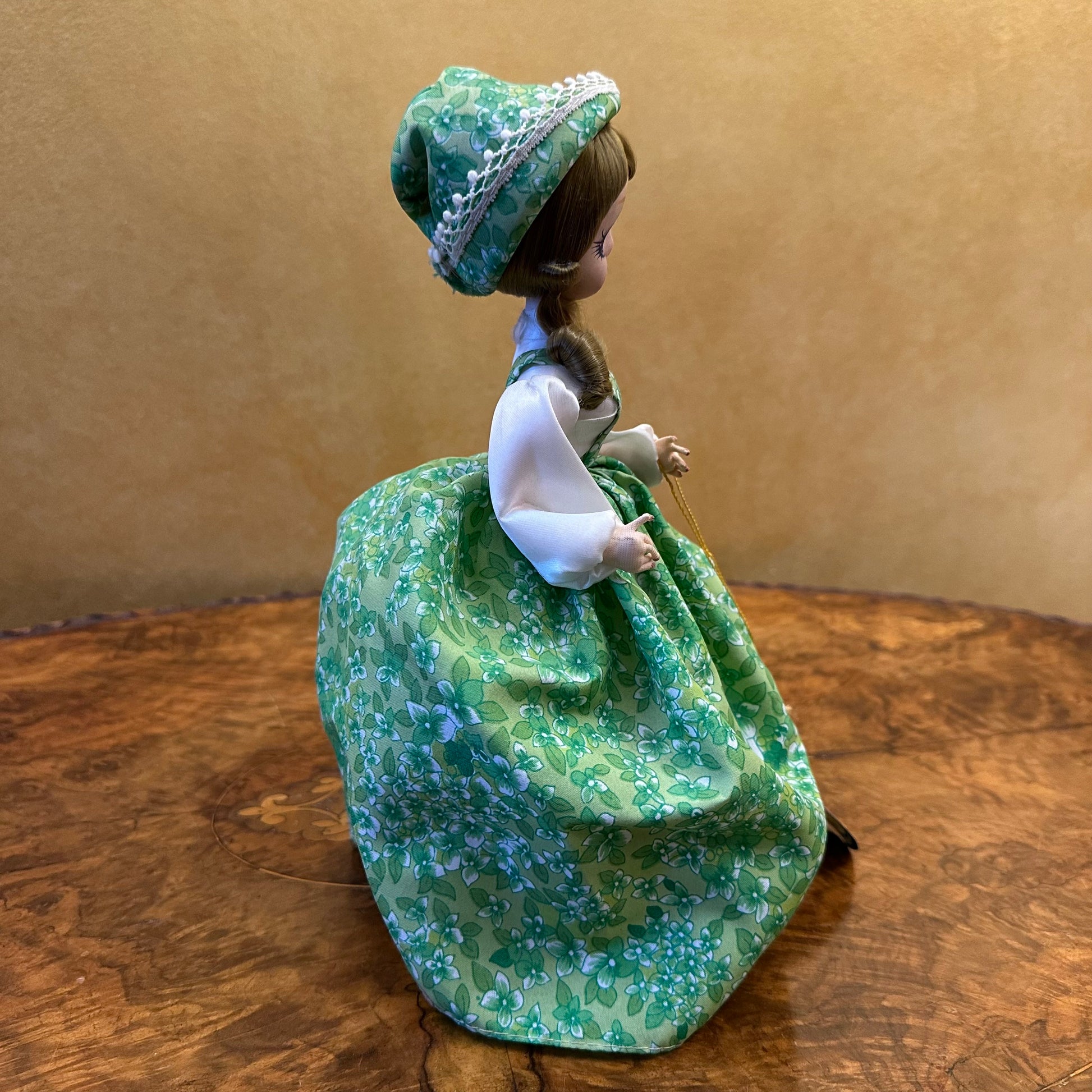 Description: Doll in a green dress and hat, she has a tag Miss Maryanne, some marks to her face.