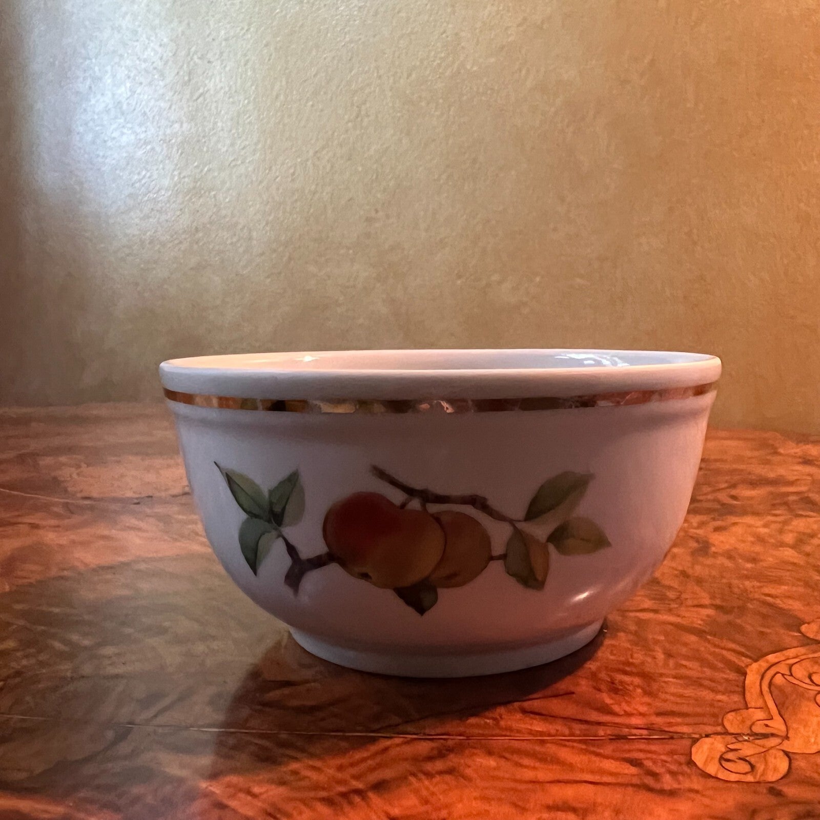 Description: Fruits print from Royal Worcester Evesham collection, there is wear to gold trim around the bowl.