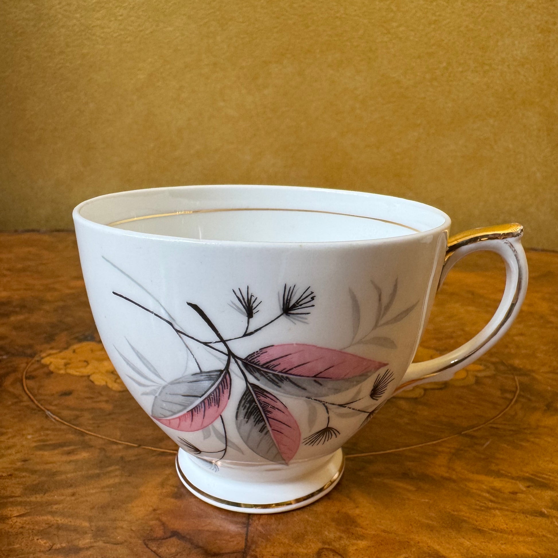 Description: Pink and grey leaves print with gold trim, some wear to the gold trim, stamped Windsor England